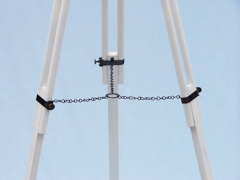 The white wooden tripod stand features smooth, polished round legs, each with bronze fittings and a screw release to let you adjust the height. A bronze chain holds the three wooden legs together to maintain the telescope's position