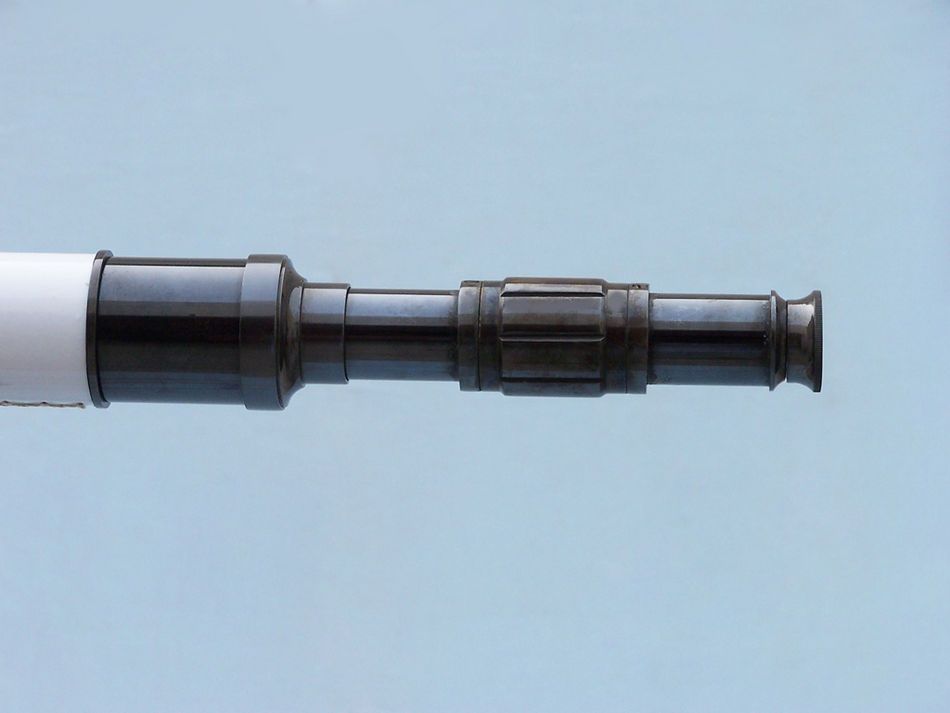 This Hampton Nautical Admiral's Floor Standing Oil Rubbed Bronze with White Leather Telescope 60" is a beautiful, 100% bronze, refractor telescope mounted on a wooden tripod. The perfect gift for the nautical explorer, this telescope is a fully functioning nautical masterpiece that adds class and sophistication to any room. The main scope is oil rubbed bronze wrapped in white leather, which shines beautifully when placed in the sunlight. Focusing is accomplished by adjusting the eyepiece ring on the telescope tube, with up to 15x magnification. A removable bronze cap, connected by a chain, protects the objective lens.