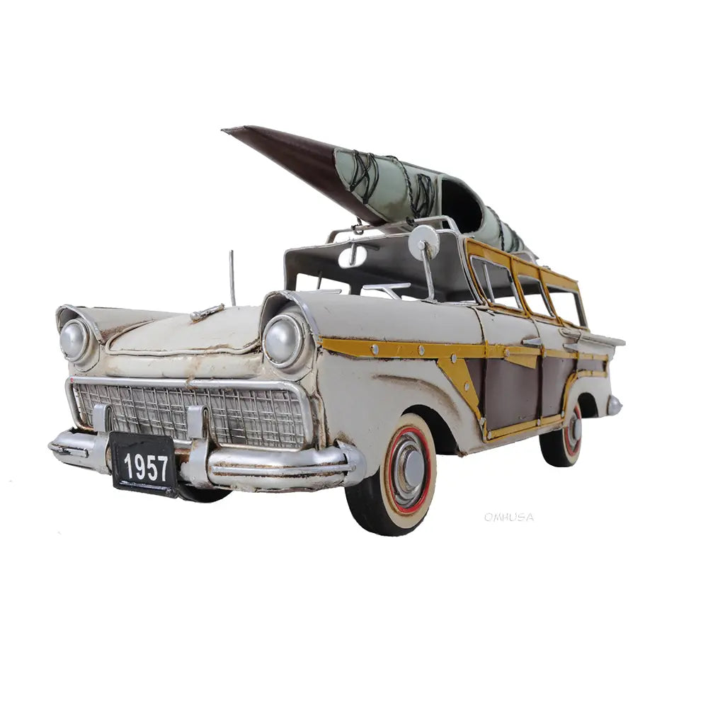 Travel back in time with this classic 1957 Ford Woody-look Country Squire model. The best selling American made wagon of its time. It is made of iron and has a scale of 1:15. It features many intricate details such as fenders, wheels, front bumper, grills, license plate, roof rack, and kayak. A perfect gift to display in your home or office!