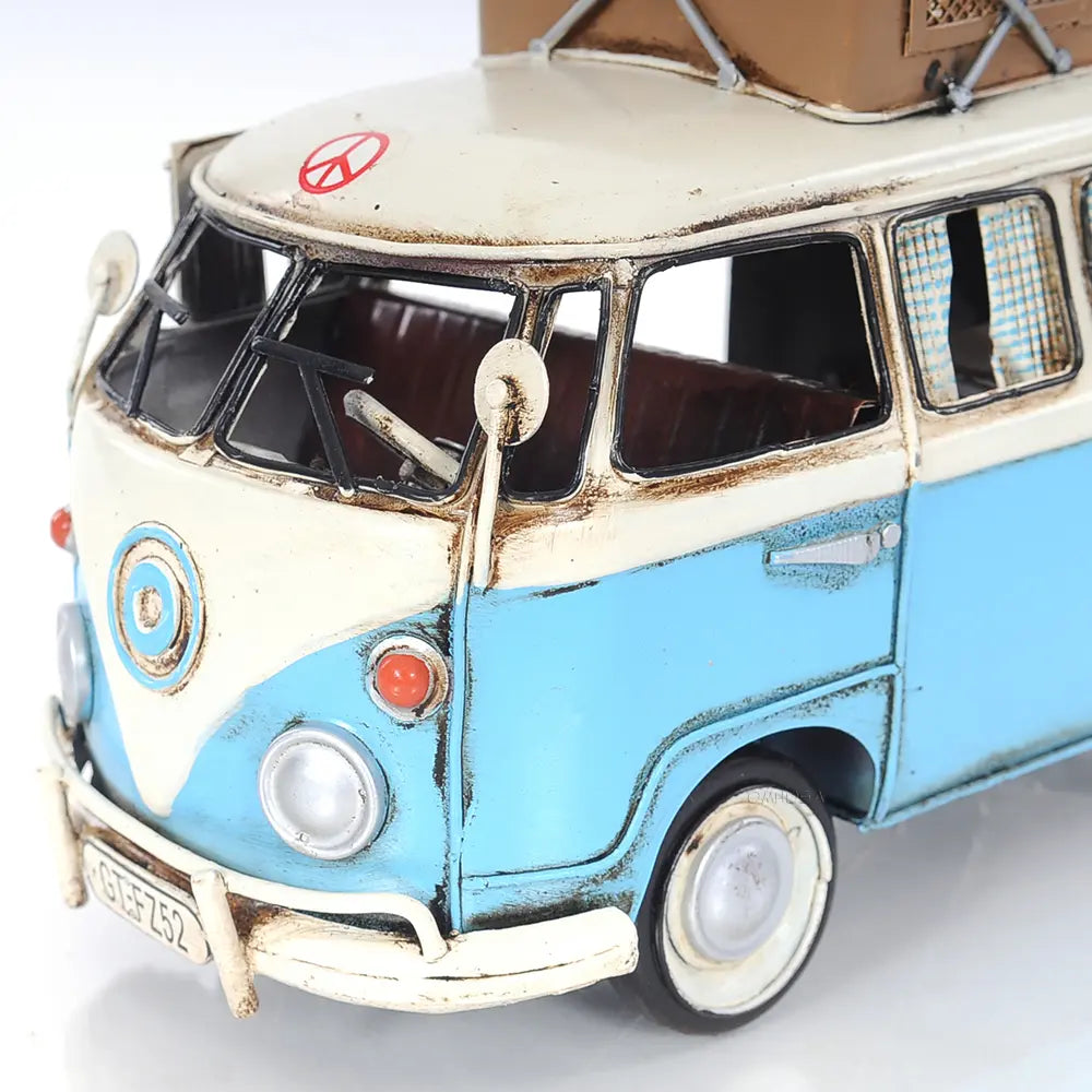 Hit the road with this retro-style camp bus model, a handmade scale replica of the famous split windshield Volkswagen bus produced in the 60s. Also known as the microbus, minibus, or hippie van, the camp bus was an emblem of freedom, resistance, and good vibrations. This historically accurate model is handcrafted from iron and features hand-painted details and decal insignia. Enjoy intricate details such as rolling wheels, seats, steering wheel, minor details on the dash, camping gear, and a table in the rear.