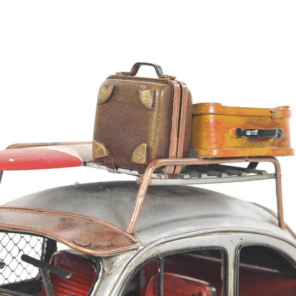 Travel back in time with this classic Volkswagen Beetle model, the world's most influential car of the 20th century. This historically accurate model is handcrafted from iron and has a scale of 1:15. Delightfully painted in vintage metallic color, it features many intricate details such as fenders, wheels, front bumper, windshield wipers, license plate, roof rack, and luggage with surfboard. A perfect gift to display in your home or office for Bug lovers!