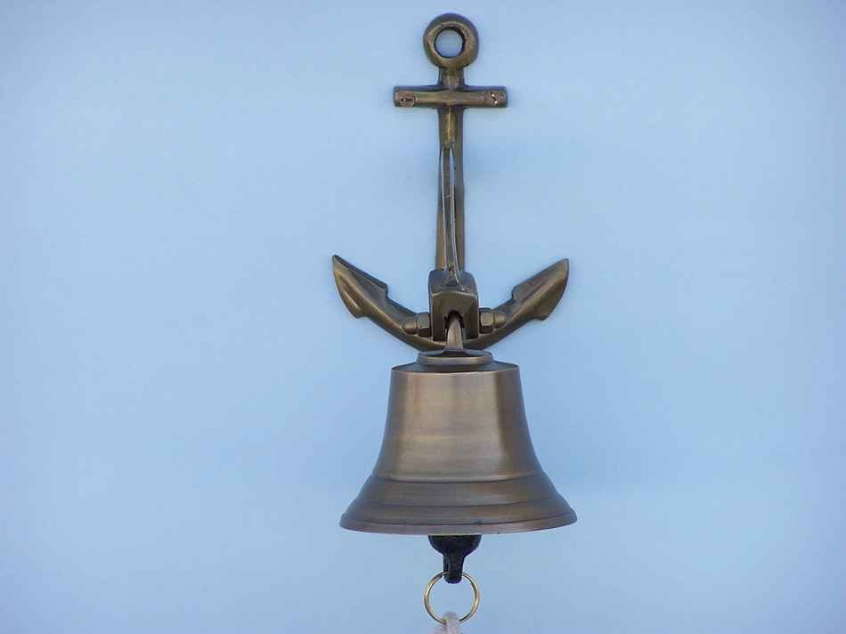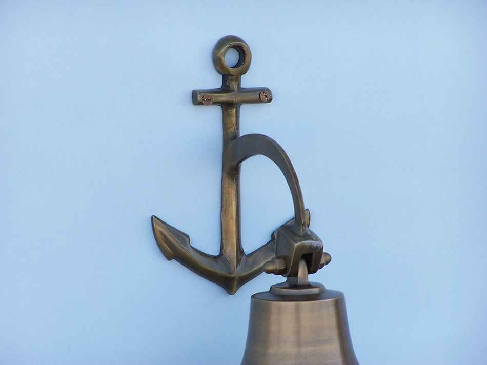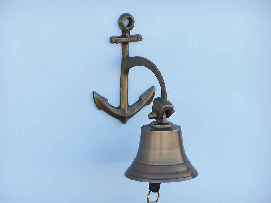 Elegantly designed, this fabulous Antique Brass Hanging Anchor Bell is equally stunning indoors or out. In addition to being fully functional, this ships bell is a great addition to any nautical decor themed room. Make a nautical wall decor statement showing this anchor decoration, and enjoy this wonderfully decorative style and distinct, warm "strike through" nautical tone with each and every resounding ring.