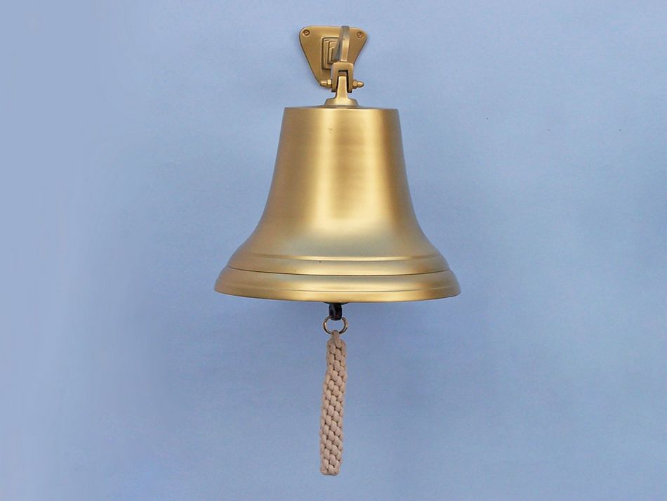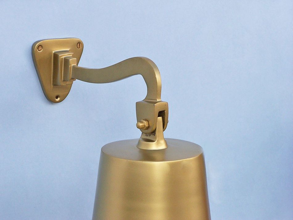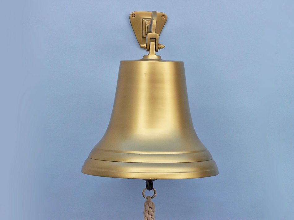 Elegantly designed and gleaming with an antique shine, this fabulous Antique Brass Hanging Ship's Bell 18" is equally stunning indoors or out, and is fully functional for actual use aboard any ship. Enjoy its wonderfully decorative style and distinct, warm nautical tone with each and every resounding ring. Each bell's length is measured from the highest point of its hanger to the lower lip of the bell, while the width is the diameter of the flared bell opening.