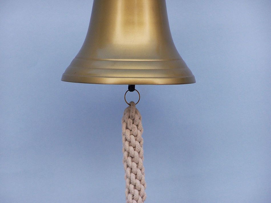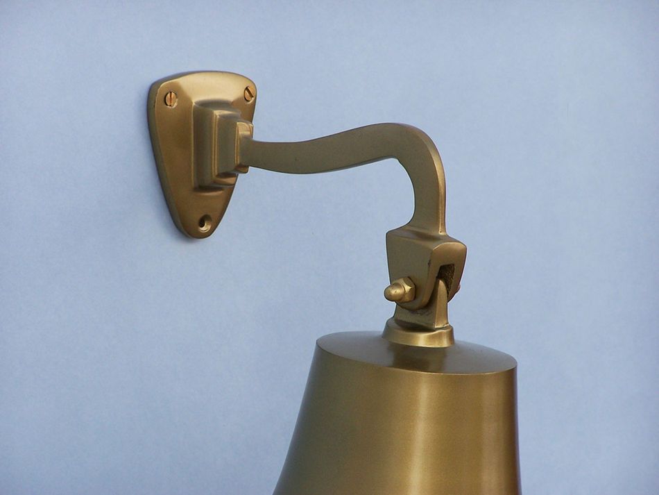 Elegantly designed and gleaming with an antique shine, this fabulous Antique Brass Hanging Ship's Bell 9" is equally stunning indoors or out, and is fully functional for actual use aboard any ship. Enjoy its wonderfully decorative style and distinct, warm nautical tone with each and every resounding ring. Each bell's length is measured from the highest point of its hanger to the lower lip of the bell, while the width is the diameter of the flared bell opening.