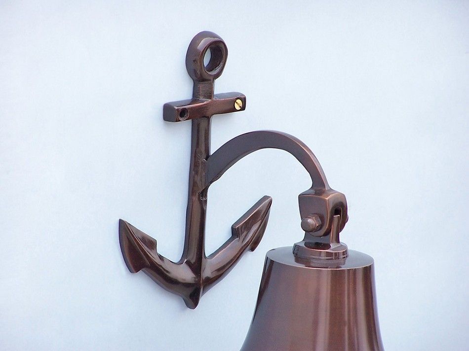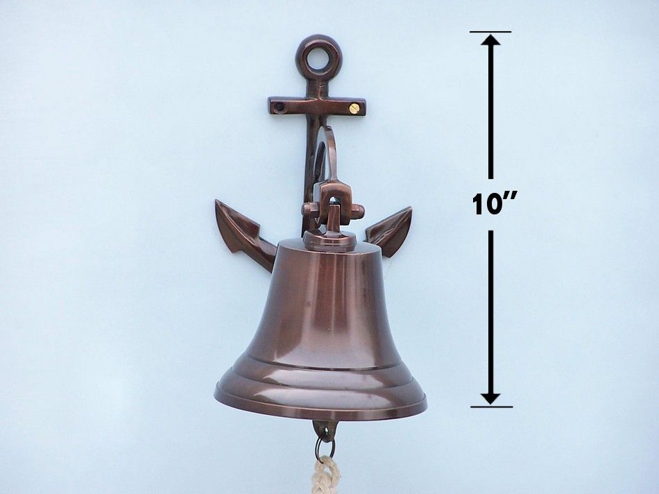 Elegantly designed and gleaming with a lustrous shine, this fabulous Antique Copper Hanging Anchor Bell 10" is equally stunning indoors or out. In addition to being fully functional, this vintage bell is a great addition to any nautical decor themed room. Make a nautical wall decor statement and enjoy this wonderfully decorative style and distinct, warm "strike through" nautical tone with each and every resounding ring.