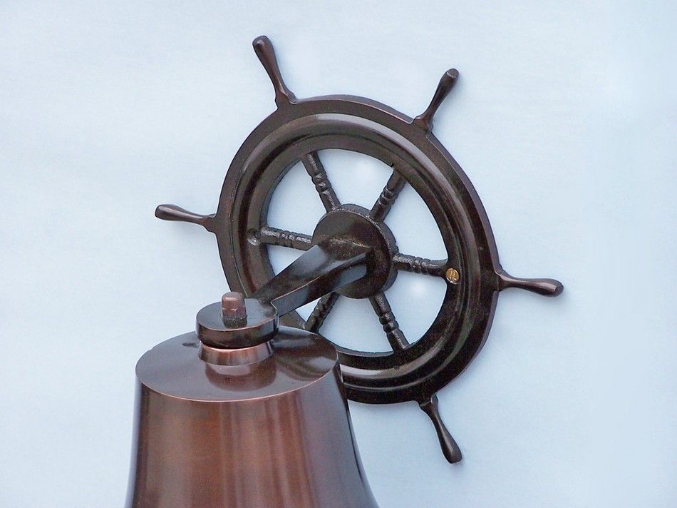 Elegantly designed and gleaming with a lustrous shine, this fabulous Antique Copper Hanging Ship Wheel Bell 8" is equally stunning indoors or out. In addition to being fully functional, this marine bell is a great addition to any nautical home design. Make a statement in your nautical theme room and enjoy this wonderfully decorative style and distinct, warm "strike through" nautical tone with each and every resounding ring.