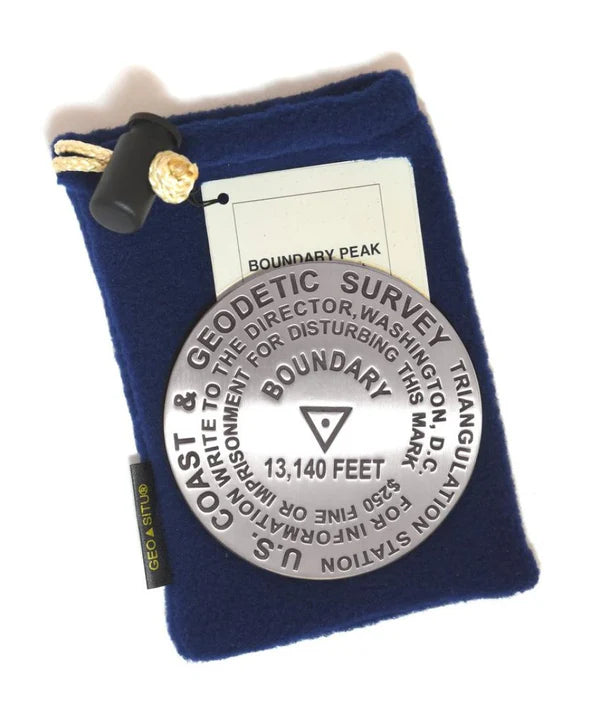 - 3 1/4 inch diameter Cast in fine pewter Felt backing With soft fleece pouch In clear-vinyl covered box PLACE NAME: Boundary Peak ELEVATION: 13,140 ft. COORDINATES: N37° 50' 46'' W118° 21' 00'' LOCATION: Inyo National Forest, Nevada, USA MARKERSLEUTH PHOTO CONTRIBUTOR: Greg and Mary Stone Boundary Peak is the highest point of the state of Nevada and is located in the White Mountain range. It is characterized by its challenging elevation gain of 2300 feet in 1.5 miles followed by a half mile of poor trail to the summit. Boundary Peak derives its name from its position on the boundary line shared by Nevada and California.