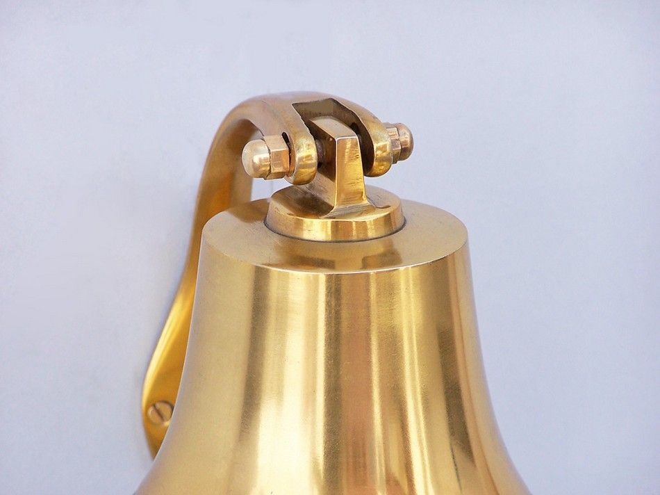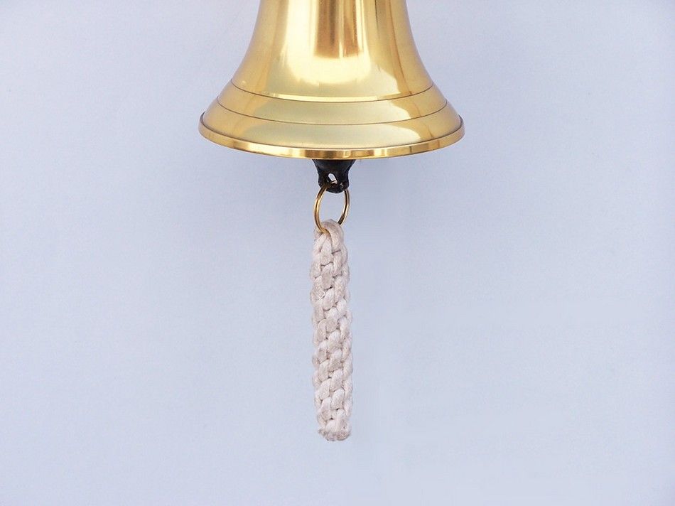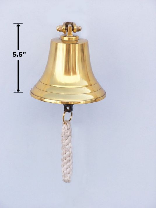 Elegantly designed and gleaming with a lustrous shine, this fabulous Brass Plated Hanging Harbor Bell 5.5" is equally stunning indoors or out, and is fully functional for actual use on the docks. Enjoy its wonderfully decorative style and distinct, warm nautical tone with each and every resounding ring. Each bell's length is measured from the highest point of its hanger to the lower lip of the bell, while the width is the diameter of the flared bell opening.