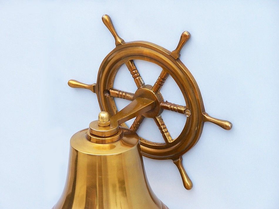 Elegantly designed and gleaming with a lustrous shine, this fabulous Brass Plated Hanging Ship Wheel Bell 8" is equally stunning indoors or out. In addition to being fully functional, this ships bell is a great addition to any nautical home design. Make a statement in your nautical theme room and enjoy this wonderfully decorative style and distinct, warm "strike through" nautical tone with each and every resounding ring.