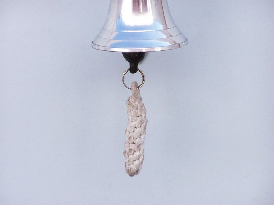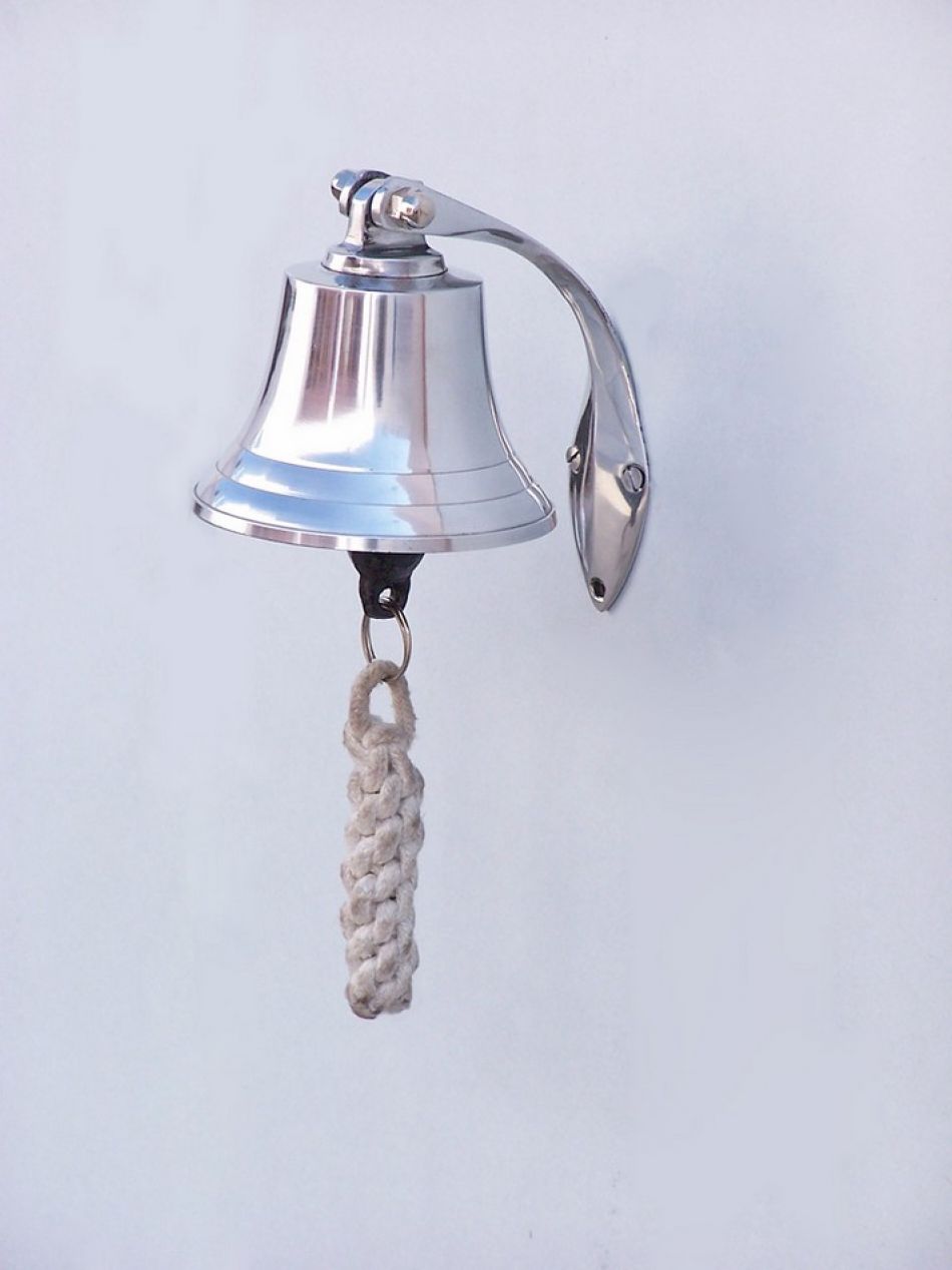 Elegantly designed and gleaming with a lustrous shine, this fabulous Chrome Hanging Harbor Bell 4" is equally stunning indoors or out, and is fully functional for actual use on the docks. Enjoy its wonderfully decorative style and distinct, warm nautical tone with each and every resounding ring. Each bell's length is measured from the highest point of its hanger to the lower lip of the bell, while the width is the diameter of the flared bell opening.