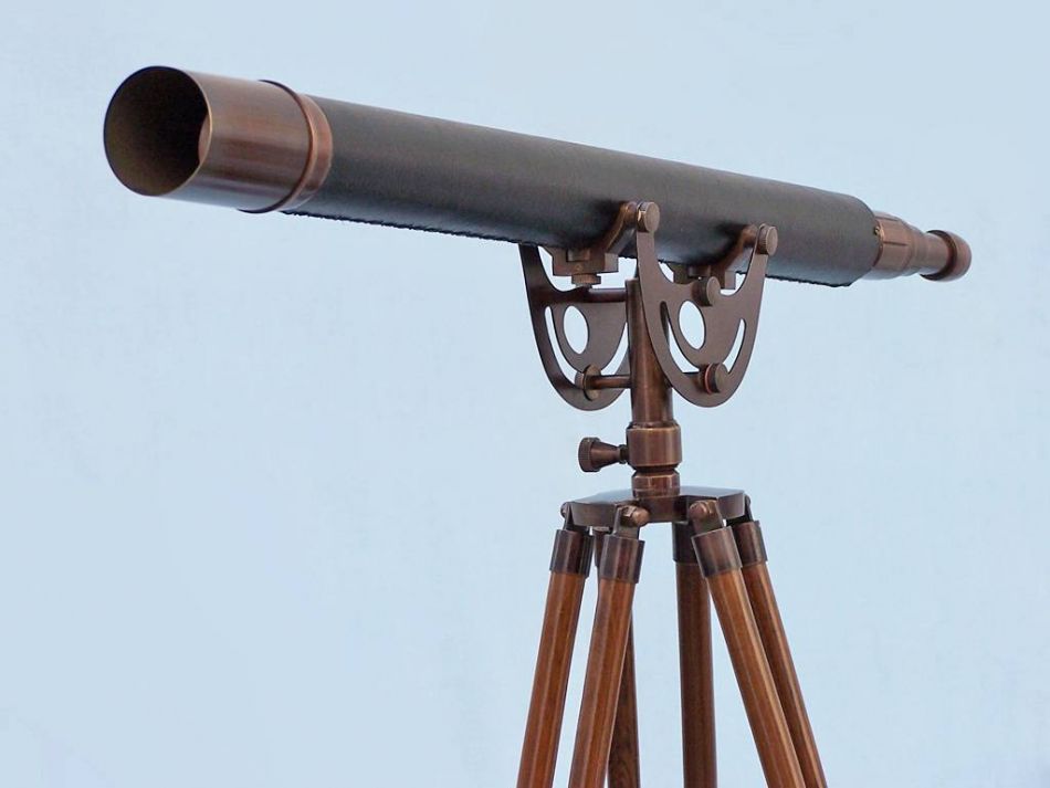 The Floor Standing Antique Copper/Leather Anchormaster Telescope 65" is a beautiful, antique copper and leather, refractor telescope mounted on a wooden tripod. This leather telescope is a fully functioning nautical masterpiece that adds class and sophistication to any room it’s in. This is a perfect nautical gift for the explorer in your life. The main scope is antique copper wrapped in leather, which shines beautifully when placed in the sunlight. Focusing is accomplished by adjusting the eyepiece ring on the telescope tube, with up to 18x magnification.