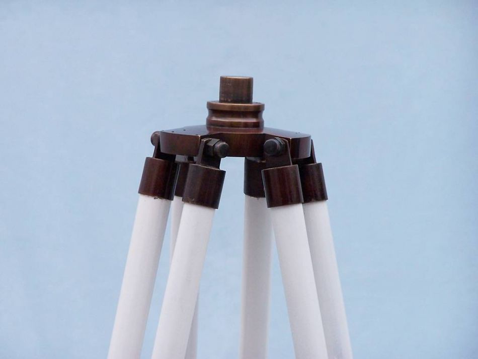 The Hampton Nautical Floor Standing Bronzed With White Leather Galileo Telescope 65" is by far our standout choice amongst nautical enthusiasts worldwide. Constructed from 100% bronze, this refractor telescope is mounted on a wooden tripod. This telescope is a fully functioning nautical masterpiece that adds class and sophistication to any room it’s in. This is a perfect gift for the nautical explorer, an appropriate piece to spruce up an office for the busy executive, or perfectly position this exquisite telescope by your window sill to stargaze. The main scope is bronze wrapped in white leather, which shines beautifully when placed in the sunlight. Focusing is accomplished by adjusting the eyepiece ring on the telescope tube, with up to 15x magnification. A removable bronze cap, connected by a chain, protects the objective lens.