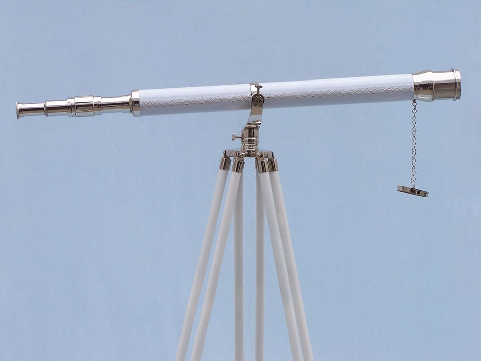 The Hampton Nautical Chrome/White Leather Galileo Telescope 65" is by far our standout choice amongst nautical enthusiasts worldwide. Constructed from 100% chrome, this refractor telescope is mounted on a wooden tripod. This telescope is a fully functioning nautical masterpiece that adds class and sophistication to any room it’s in. This is a perfect gift for the nautical explorer, an appropriate piece to spruce up an office for the busy executive, or perfectly position this exquisite telescope by your window sill to stargaze. The main scope is solid chrome wrapped in white leather, which shines beautifully when placed in the sunlight. Focusing is accomplished by adjusting the eyepiece ring on the telescope tube, with up to 15x magnification. A removable chrome cap, connected by a chain, protects the objective lens.