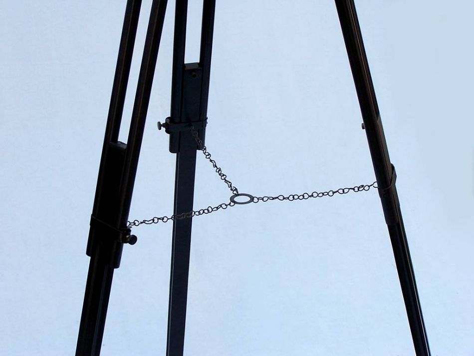 The black wooden tripod stand features smooth, polished round legs, each with oil-rubbed bronze fittings and a screw release to let you adjust the height. An oil-rubbed bronze chain holds the three black wooden legs together so the telescope can maintain its position.