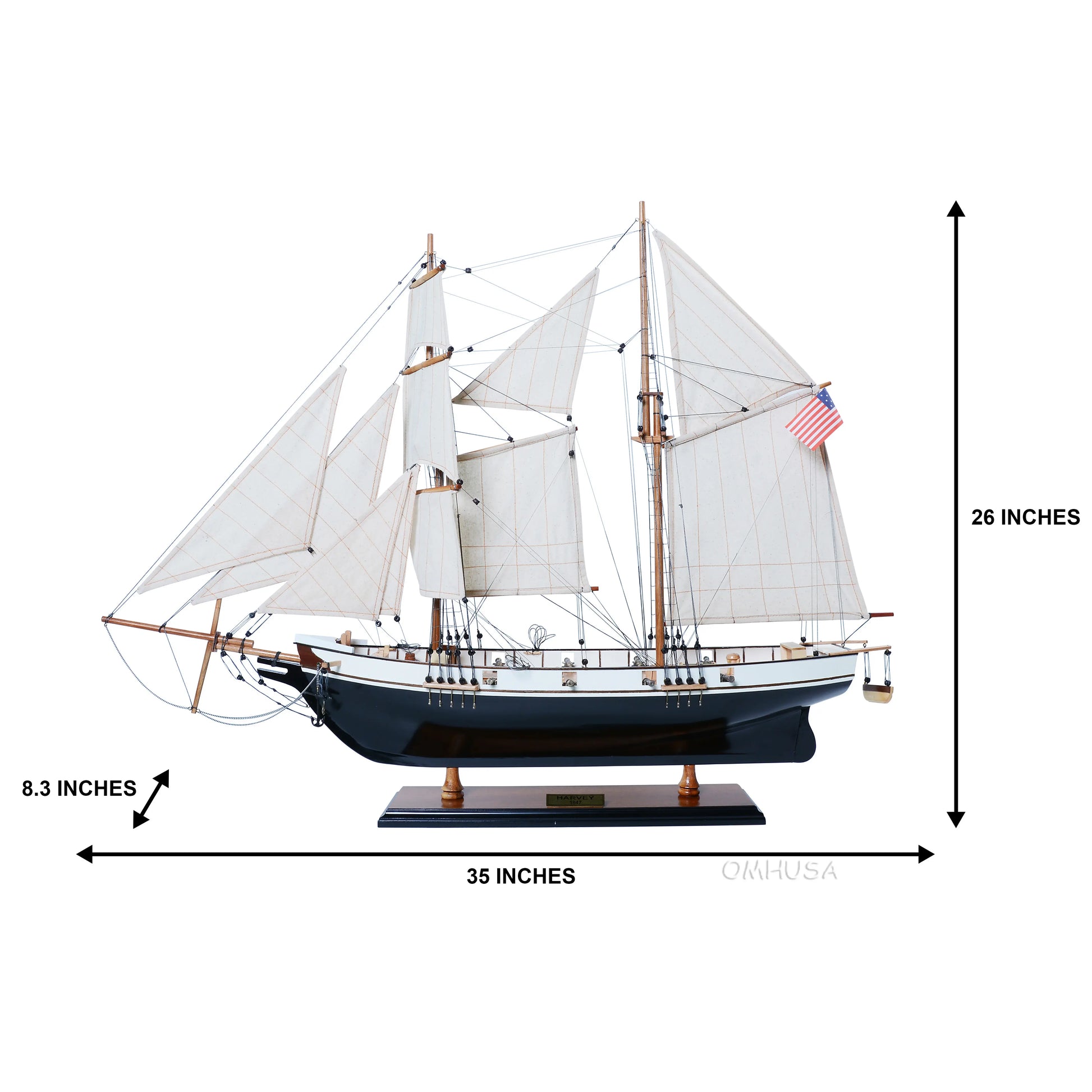 This beautiful Harvey model features: two tone painted black and white colors on the hull, plank on frame, and two decks. The front bowsprit and three large masts are connected securely using advanced rigging and lines painstakingly knotted and fastened by hand. Each yard has an attached hand-stitched unfurled sails made of fine linen. Metal anchors and a wooden rudder are visible on the front and rear of the ship. On the deck, there are metal stationed cannons, wooden windlass, bell tower, and many other spectacular ornaments.