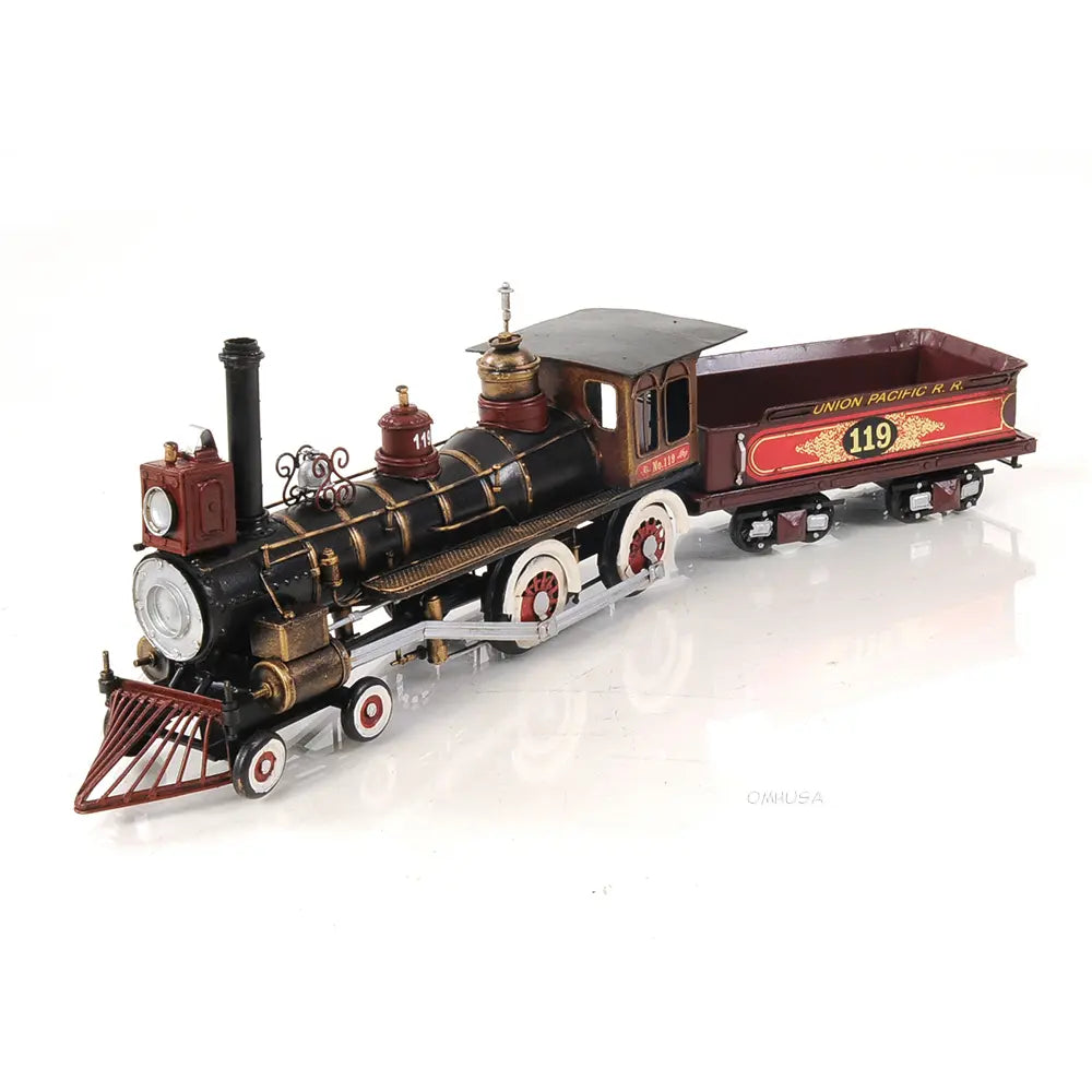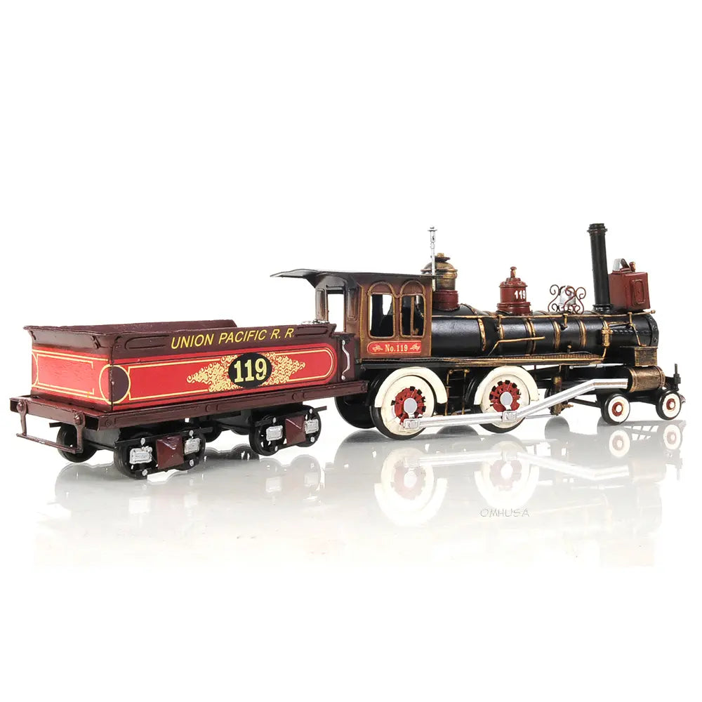 The No. 119 was a 4-4-0 steam locomotive which made history as one of the two locomotives (the other being the Jupiter) to meet at Promontory Summit during the Spike ceremony commemorating the completion of the First Transcontinental Railroad. No. 119 was built by Rogers Locomotive and Machine Works of Paterson, New Jersey in 1868 along with numbers 116, 117, 118 and 120. This engine was scrapped in 1903, and a replica was built in 1979, 76 years after the scrapping. No. 119 was stationed in Ogden, Utah, when a call came from Thomas C. Durant, traveling to Promontory, who needed an engine. Similar to Leland Stanford and the Jupiter, previous misfortunes allowed No. 119 to take her place in history. Durant, the vice president of the Union Pacific Railroad was traveling on the so-called Durant Special for the ceremony at Promontory. A swollen river had washed away some supports to the Devils Gate Bridge. Durants engineer refused to take the current engine across but did consent to nudge the lighter passenger cars across the bridge. The bridge held, the cars made it across but Durant and his entourages were left without an engine. Durants plight was answered when No. 119 was sent from Ogden to take the Durant Special the short distance to Promontory where it came nose to nose with the Central Pacifics Jupiter. In Andrew J. Russells famous photograph of the Meeting of the Lines, No. 119 is seen on the right with its engineer, Sam Bradford, leaning off the pilot holding a bottle of champagne up to Jupiter engineer George Booth. Bradford and Booth would later break a bottle of champagne over the others locomotive in celebration.