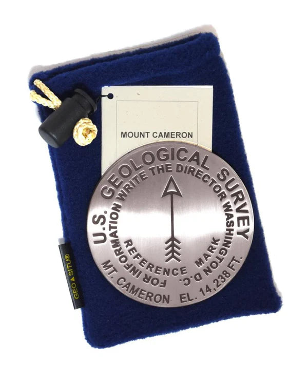 - 3 1/4 inch diameter Cast in fine pewter Felt backing With soft fleece pouch In clear-vinyl covered box PLACE NAME: Mount Cameron ELEVATION: 14,238 ft. COORDINATES: N39° 20' 49'' W106° 07' 07'' LOCATION: Ten Mile-Mosquito Range, Colorado, USA MARKERSLEUTH PHOTO CONTRIBUTOR: David Walker, 2000 Mount Cameron, along with Lincoln, Democrat, Sherman and Bross, is located in the Mosquito Range. It is considered to be a twin peak of Mount Lincoln and is not officially ranked as a 14er. The area has a mining history dating back to the mid-1800's. First ascents of Cameron and its neighbors were likely to be miners.