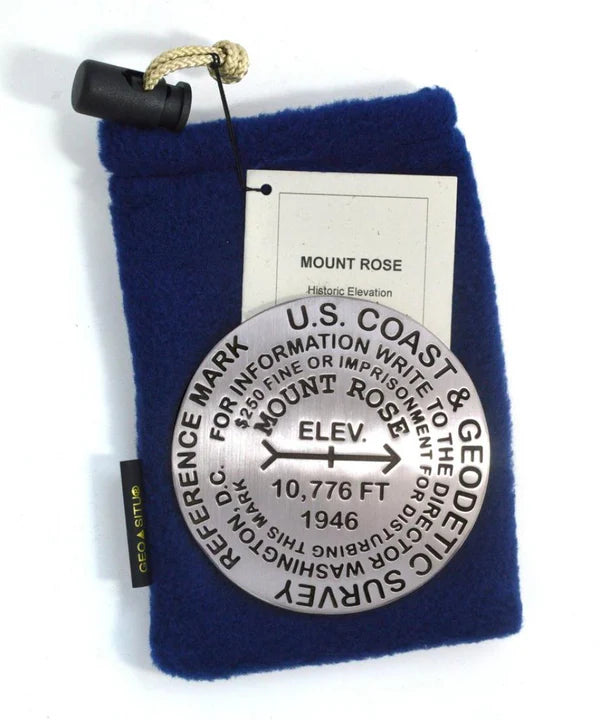 - 3 1/4 inch diameter Cast in fine pewter Felt backing With soft fleece pouch In clear-vinyl covered box PLACE NAME: Mount Rose ELEVATION: 10,776 ft. COORDINATES: N39° 20' 38'' W119° 55' 04'' LOCATION: Carson Range, Nevada, USA MARKERSLEUTH PHOTO CONTRIBUTOR/S: ED ATWELL; Brandon Collins At 10,776 feet, Mount Rose is the highest peak in Washoe County, Nevada. It offers expansive views of Lake Tahoe, the city of Reno, and the surrounding area. The first winter ascent was recorded on Jan 1, 1895 by Dr. James Edward Church. He is also credited with establishing one of the nation's first high-altitude meteorological observatories on the summit.