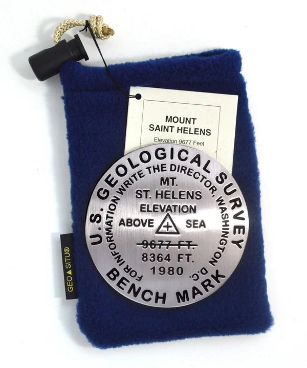 - 3 1/4 inch diameter Cast in fine pewter Felt backing With soft fleece pouch In clear-vinyl covered box PLACE NAME: St. Helens ELEVATION: 9677 ft. ELEVATION AFTER MAY 18, 1980: 8364 ft. COORDINATES: N46° 12' 00'' W122° 11' 21'' LOCATION: Mount Saint Helens National Monument, Washington, USA MARKERSLEUTH PHOTO CONTRIBUTOR: No Station Found; Original Artwork Thirty years later, following the May 18, 1980 eruption of the beautiful stratovolcano Mount Saint Helens, the Native American moniker "smoking mountain" still applies. The Cascades Volcano Observatory reports on its website "continuous intermittent volcanic activity and ...occasional eruptions of steam and ash, occasional pyroclastic flows" and "...intermittent extrusion of dome-forming."