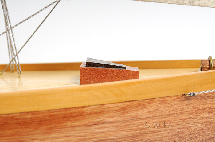 This model hull is handcrafted from strips of wood using plank on frame construction method. The deck is made from many strips of wood. There are various details on the deck such as hatches, winches, and cabin. One can also locate a metal tilter on the deck near the companionway. The stitched sail and intricate rigging complete the definition of a true sailing boat.