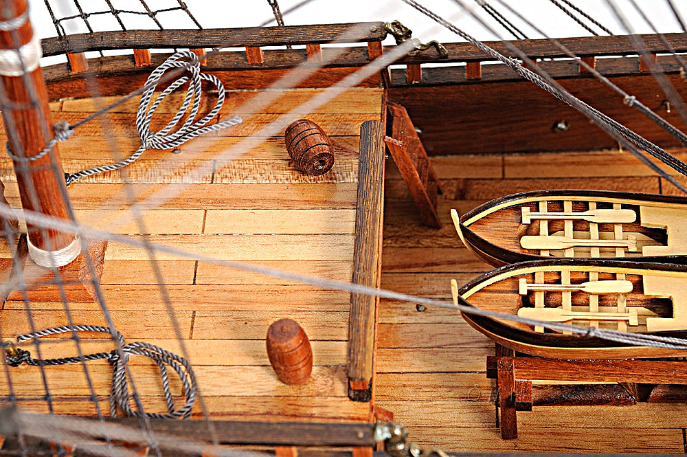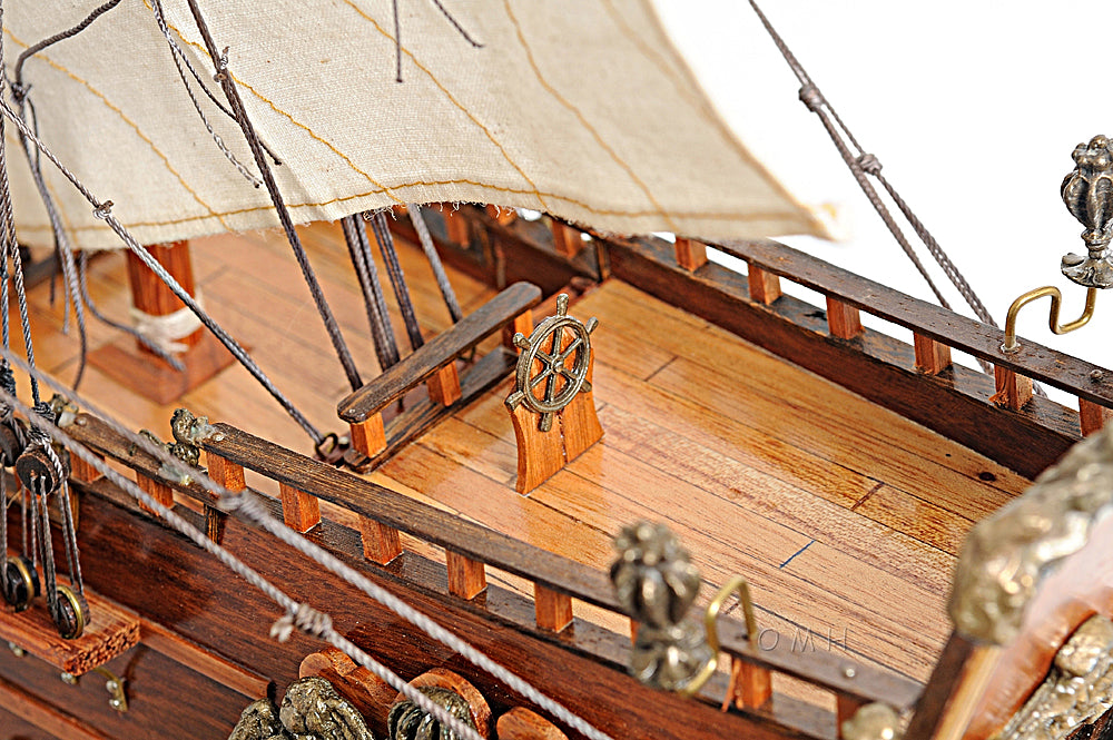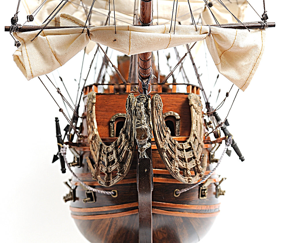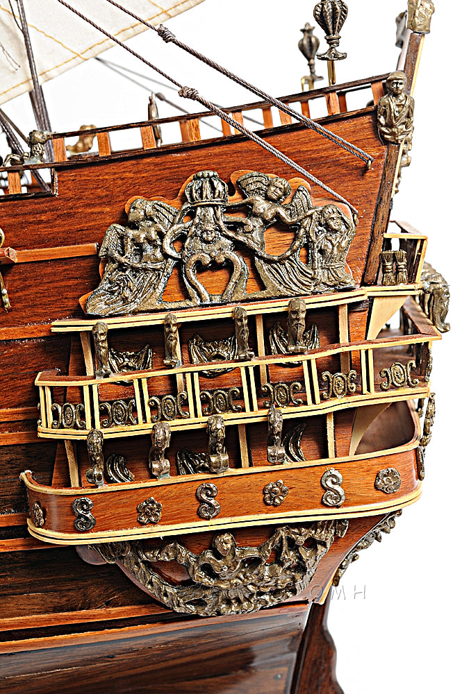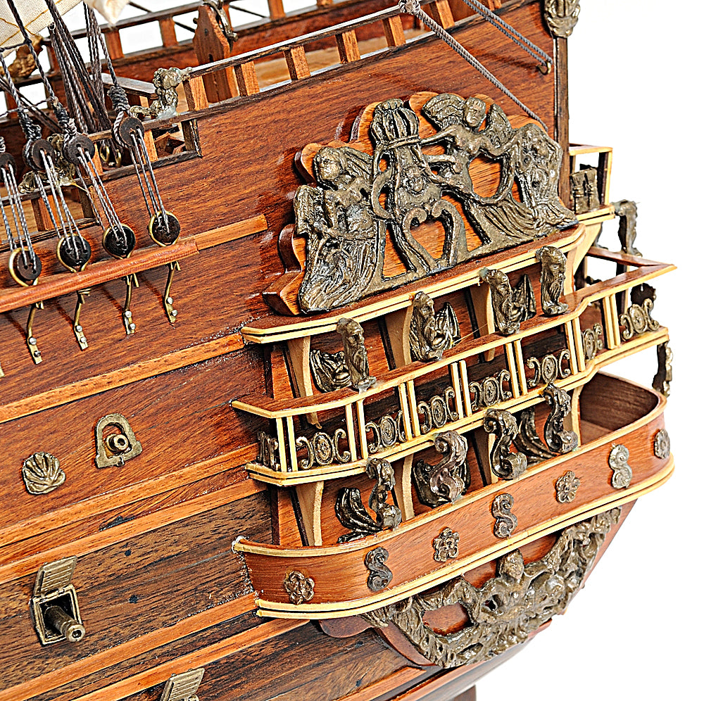 This beautiful Soleil Royal model features plank on frame, three decks, and two rows of ferocious cannons on each side of the ship. A unique bowsprit design that consists of: brass statues, crafted metal panels, and open metal doors that lead into the ship cabin. The front bowsprit and three large masts are connected securely using advanced rigging and lines painstakingly knotted and fastened by hand. Each yard has an attached hand-stitched rolled-up sails made of fine linen. Metal anchors and a wooden rudder are visible on the front and rear of the ship. On the deck, there are metal steering wheel, authentic hand-built lifeboats with ribs and planks, wooden ladders, wooden barrels, wooden windlass, and many other handcrafted ornaments. There is also an exquisite detailed admiral’s quarter on the stern with beautiful handcrafted metal lanterns, amazing metal crafted statues, and many detailed brass ornaments.