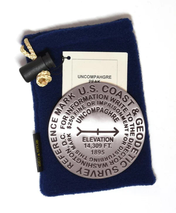- 3 1/4 inch diameter Cast in fine pewter Felt backing With soft fleece pouch In clear-vinyl covered box PLACE NAME: Uncompahgre Peak ELEVATION: 14,309 ft. COORDINATES: N38° 04' 18'' W107° 27' 41'' LOCATION: San Juan Range, Colorado, USA MARKERSLEUTH PHOTO CONTRIBUTOR: Alfred R. Kroulik, Jr., 1999 Uncompahgre Peak is the highest of six peaks over 14,000 feet in the San Juan Range of Colorado. It is rated as a "walk up" and considered to be one of the easier fourteeners to climb. Uncompahgre means "hot water spring" in the Ute Indian language, suggesting volcanic origins. According to GNIS (Geographic Names Information System), the mountain was named after the Uncompahgre River.