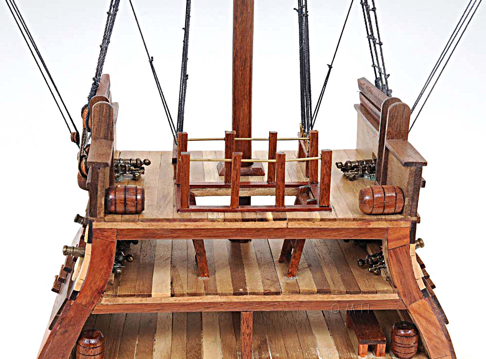 Model is handcrafted with the highest quality woods from scratch by master artisans using "plank on frame" construction, just like real boats. Each model takes more than 50 hours to construct and undergoes a demanding quality-control process. Among the details of this boat model: metal cannons, authentic crows nest, advanced intricate rigging, painted hull, inlay deck, water drums, metal ladder, metal skylight and many more. No plastic parts! The model rests on a solid wood base with a metal nameplate.