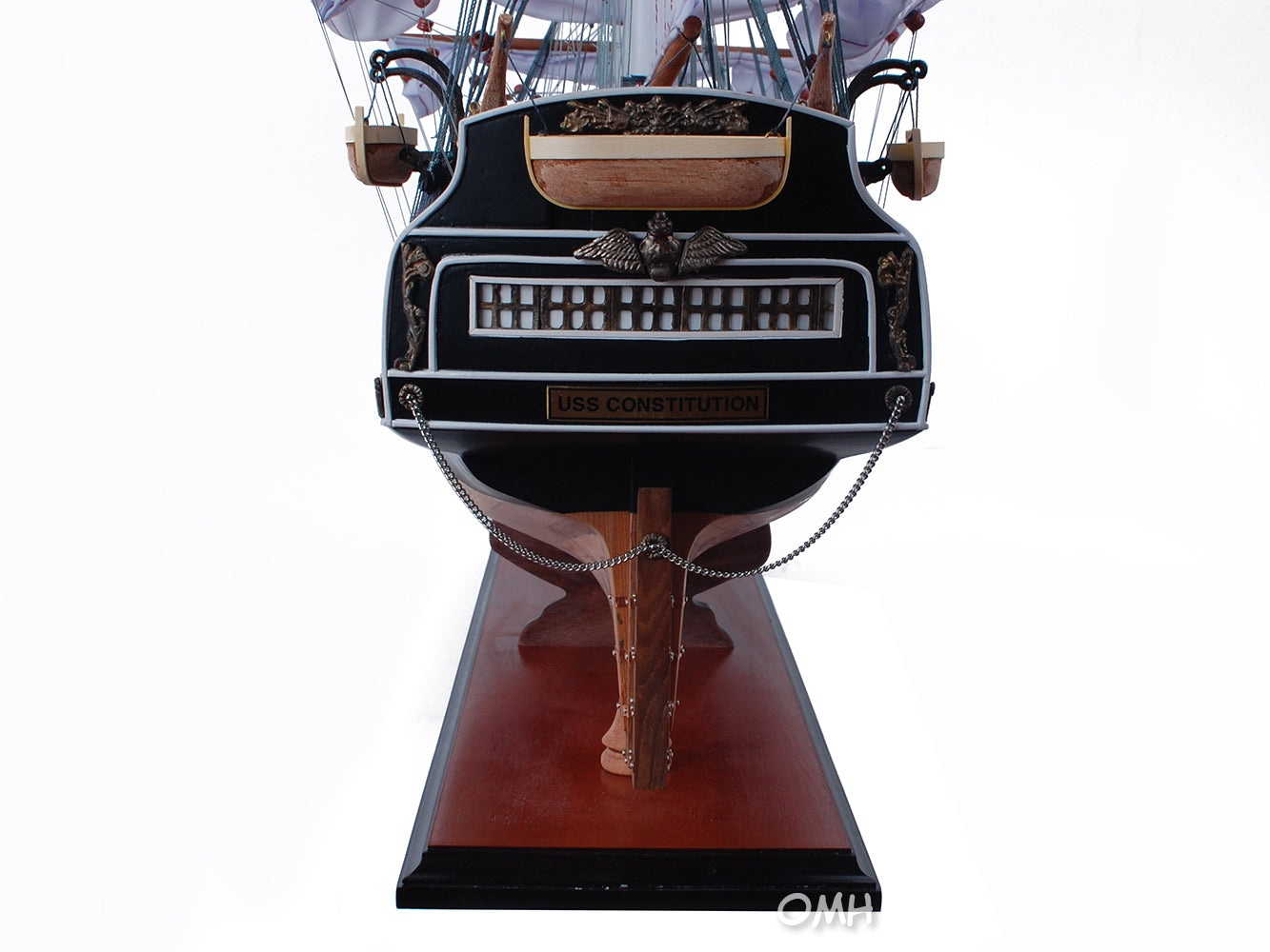 This spectacular model of the USS Constitution features plank on frame, two decks, and one stretched ferocious row of metal cannons on each side of the ship. The front bowsprit and three large masts are connected securely using advanced rigging and lines painstakingly knotted and fastened by hand. Each yard has an attached hand-stitched rolled-up sails made of fine linen. The glorious American flag is attached to the mizzen yard. Metal anchors and a wooden rudder are visible on the front and rear of the ship. On the deck, there are authentic hand-built lifeboats with ribs and planks, stationed metal cannons, metal steering wheels, metal bell, captain’s dining and sleeping cabin, and many other handcrafted ornaments. There is also an exquisite detailed admiral’s quarter on the stern with beautiful decorative brass ornaments.